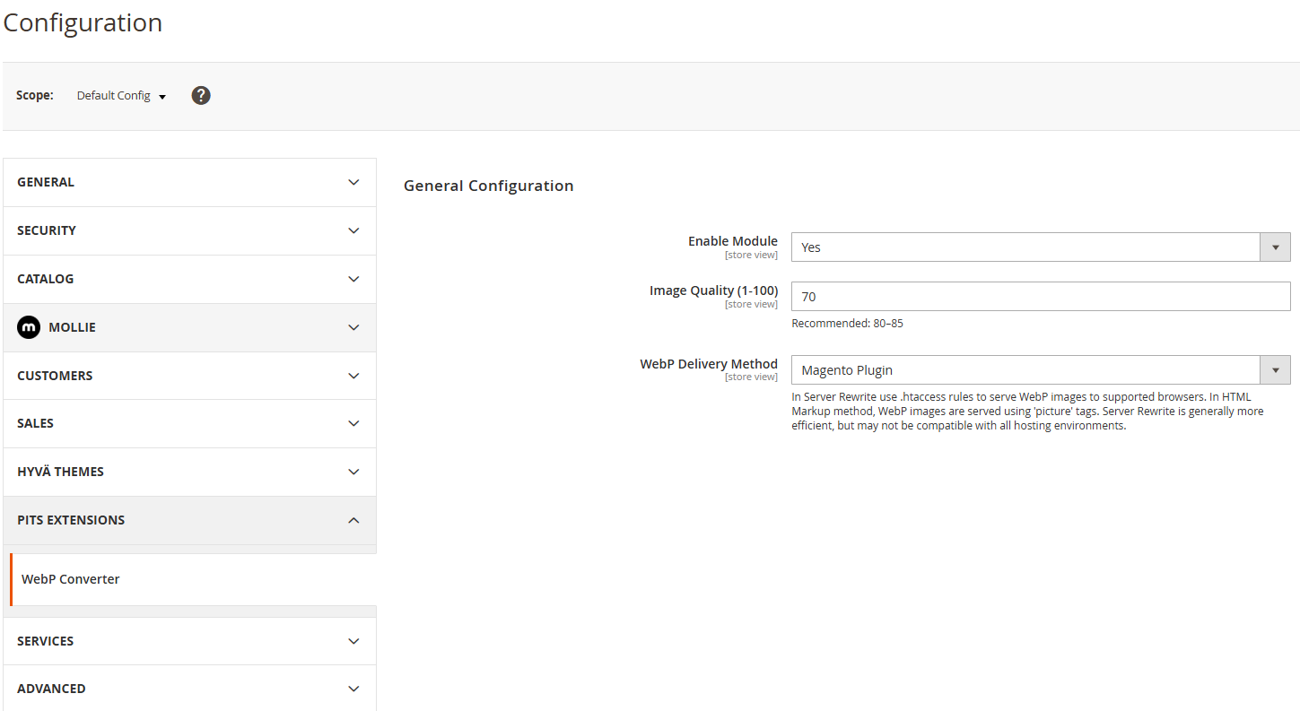Die Magento 2 WebP Image Converter-Erweiterung unterstützt sowohl die On-the-Fly-Konvertierung (Lazy) als auch die optionale Massenverarbeitung über die Befehlszeile (CLI) und bietet so Flexibilität je nach Serverkapazität und Projektanforderungen. Alle Bildkonvertierungen werden lokal auf dem Server durchgeführt, wodurch keine Dienste von Drittanbietern und keine zusätzlichen Kosten anfallen. Konvertierte Bilder werden separat gespeichert, während die Originaldateien erhalten bleiben, was einen zuverlässigen Fallback-Mechanismus ermöglicht. Administratoren können wichtige Einstellungen wie das Aktivieren/Deaktivieren der Konvertierung, die Anpassung der Bildqualität, die Auswahl der Verarbeitungsmethode und die Steuerung der Bildqualität direkt über das Magento-Backend vornehmen.