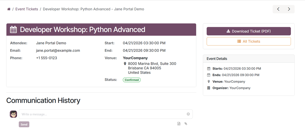 Das „Portal Event Tickets Management“ ist ein Odoo-Modul, das das Kundenportal erweitert und Veranstaltungsteilnehmern eine Self-Service-Oberfläche zur Verwaltung ihrer Veranstaltungstickets bietet. Portalbenutzer können ihre Veranstaltungstickets anzeigen, filtern, sortieren, suchen, herunterladen und darüber kommunizieren – und das alles ohne Zugriff auf das Backend.