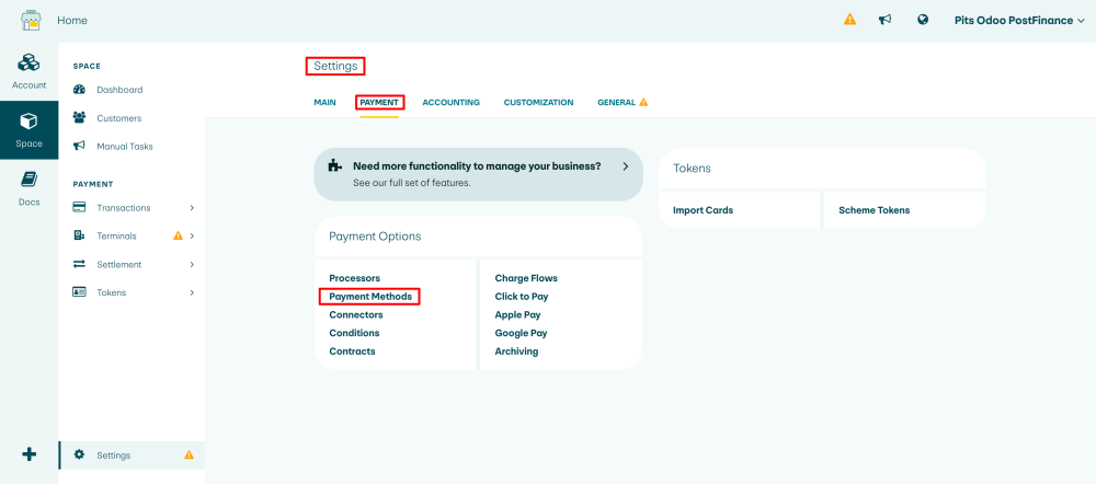 - Go to Spaces -> Settings -> Payment -> Payment Methods.