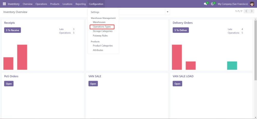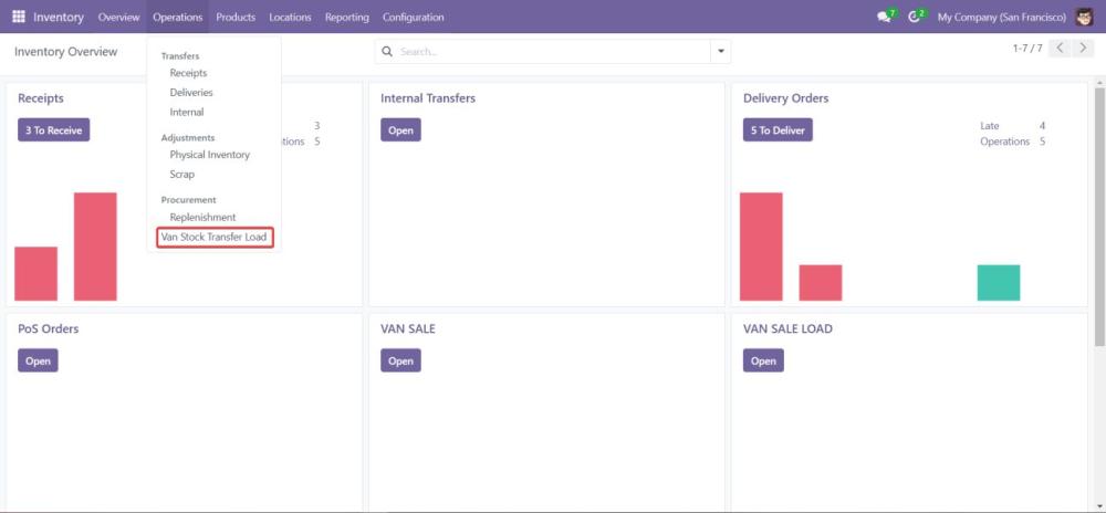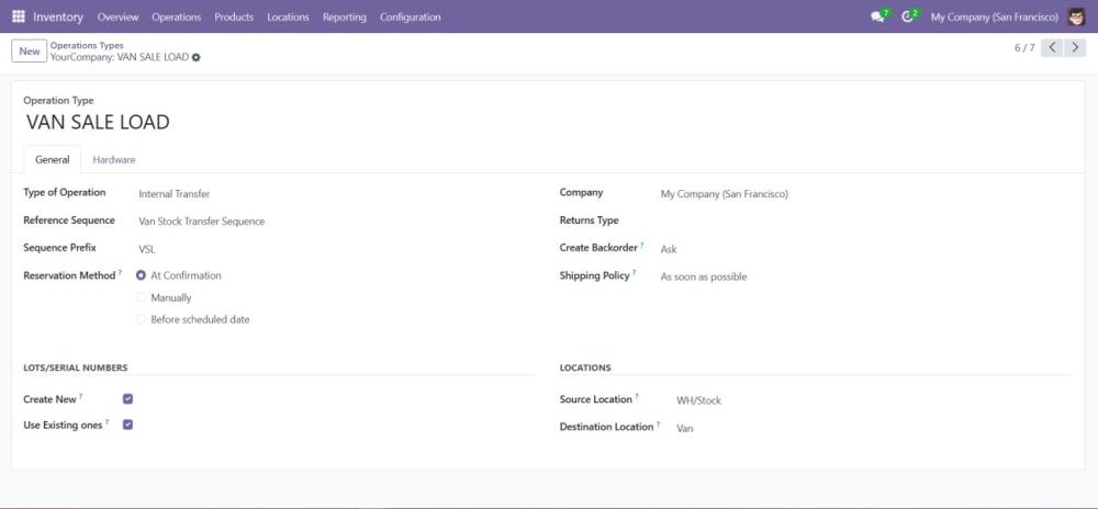 In the Inventory module, configure the locations for van stock, specifying warehouse and van locations. - Ensure Operation Types are loaded in the Inventory Module: