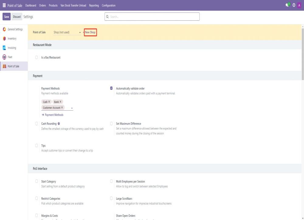 - Click on New Shop to create a new POS configuration.