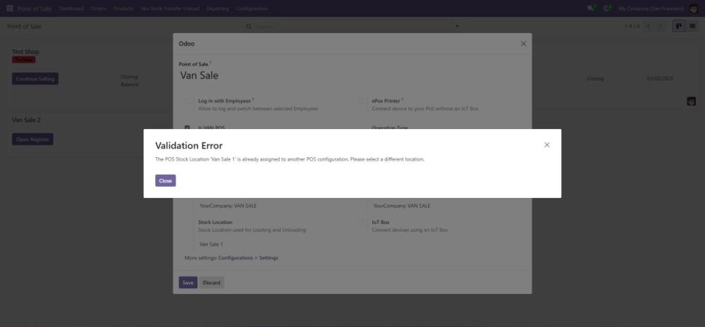 Screenshot 15: Van Point of Sale - Validation displayed if same Van is configured to more than one POS