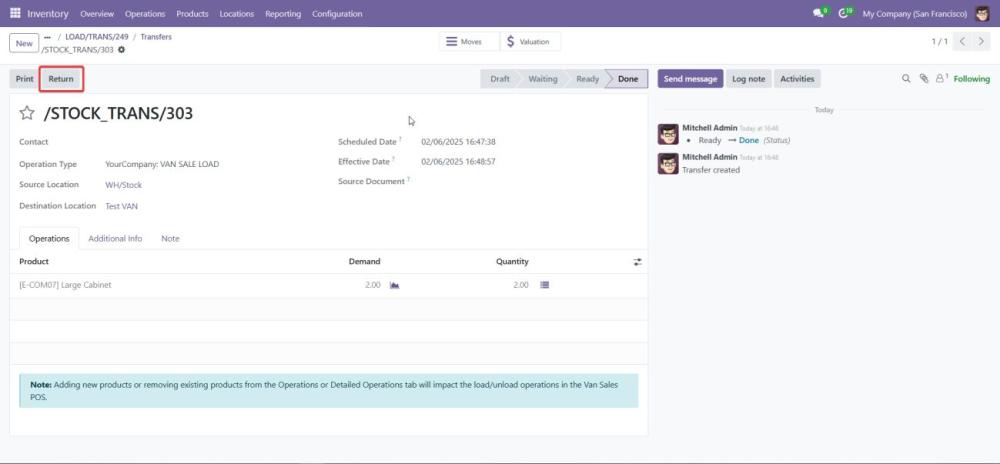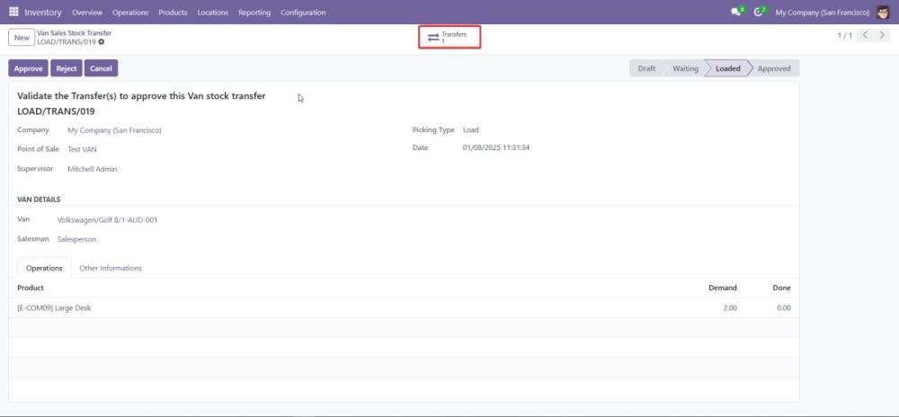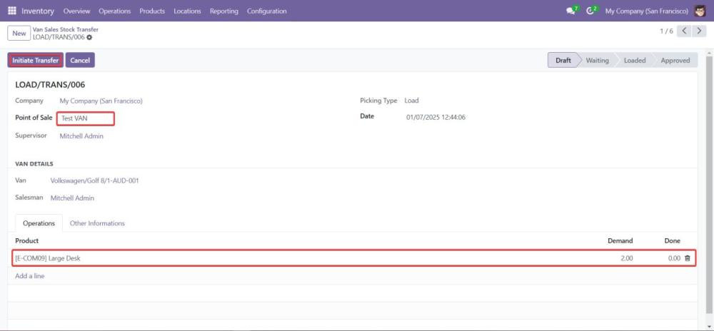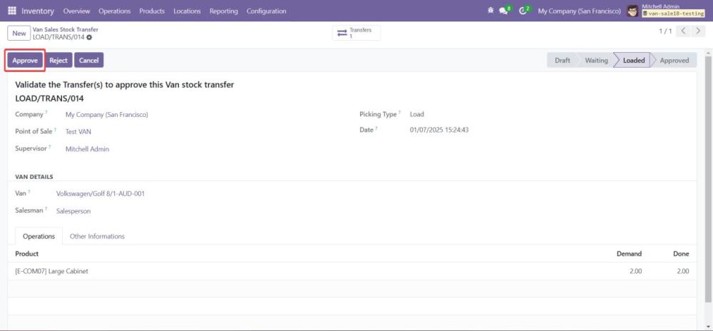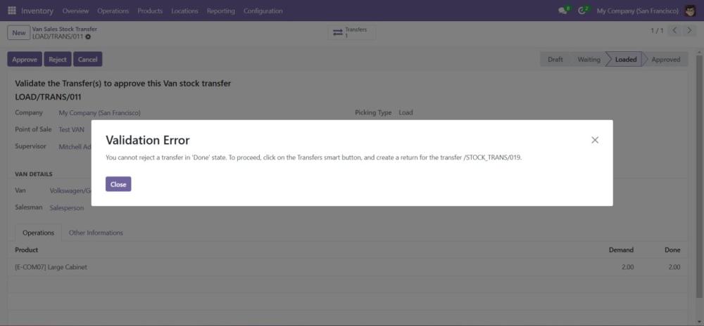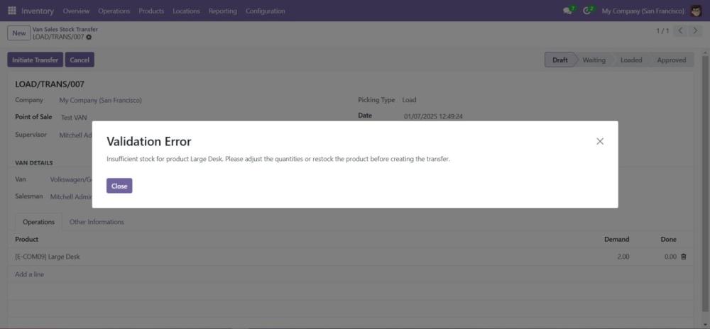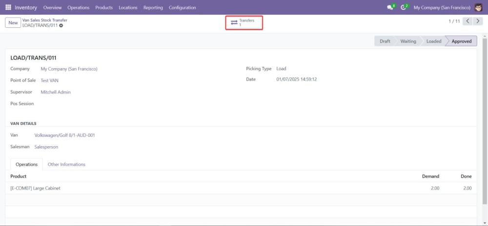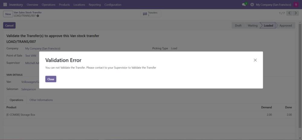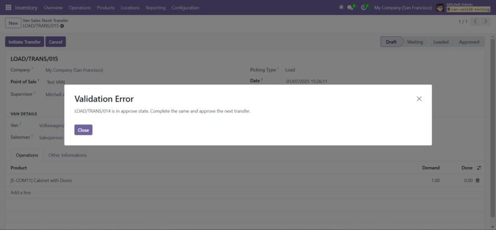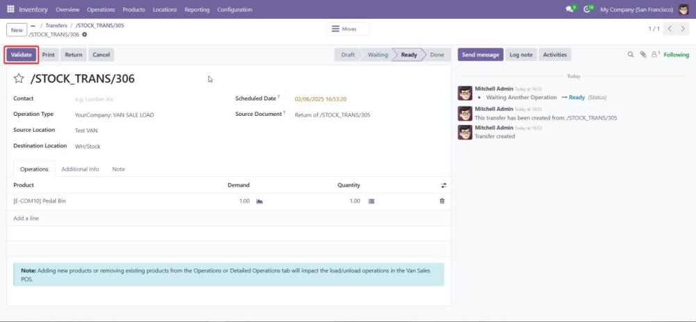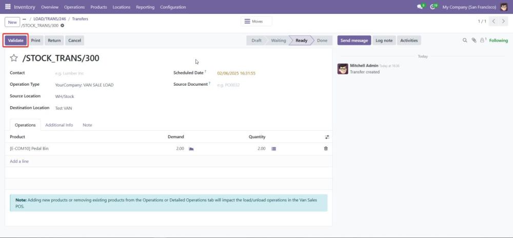 Begin the process of loading products into the van by selecting the VAN_SALE_LOAD operation type. - Validate the Load Before Transfer: