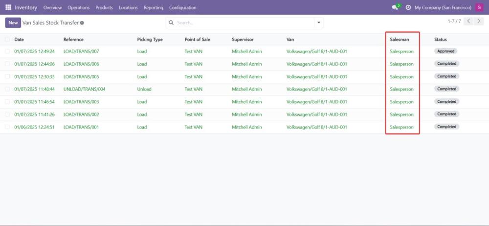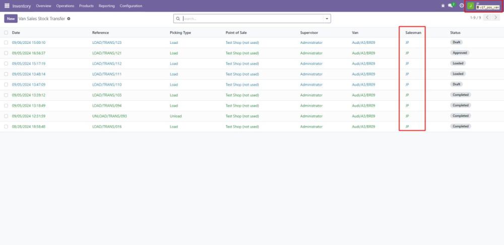 - The VAN_SALE_LOAD operation type manages the transfer of stock from warehouse locations to the van before the sales process begins.