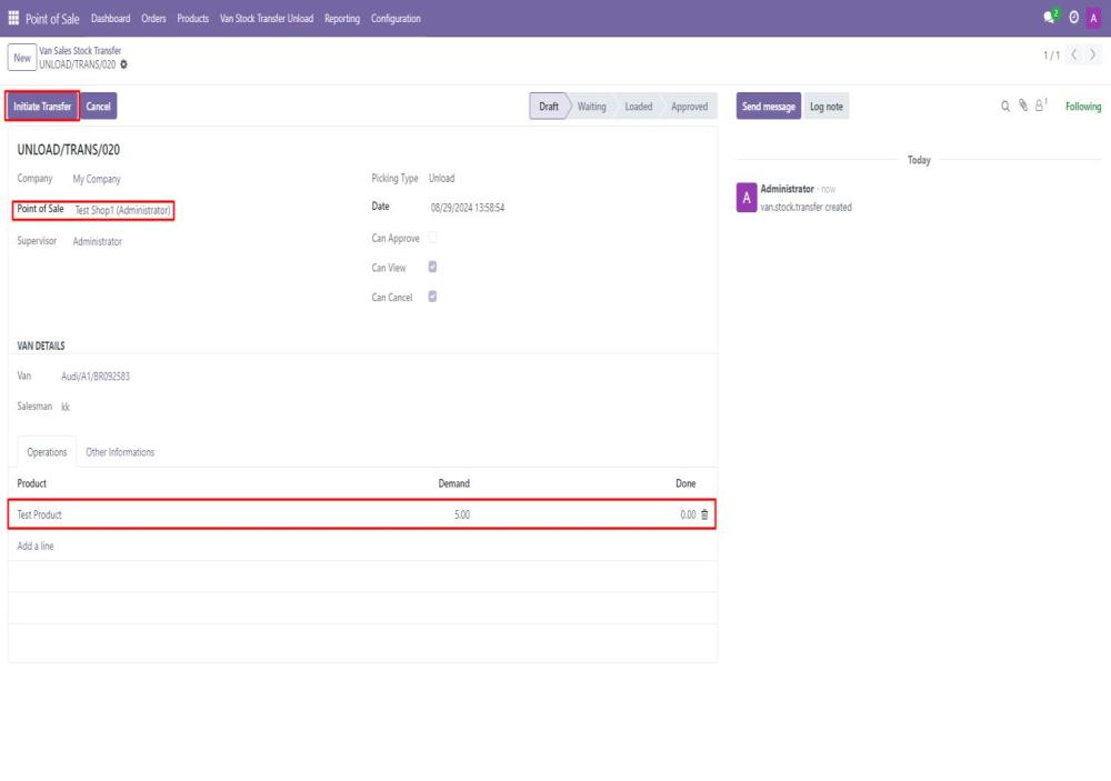 On Enabling Is Van POS checkbox, operation types (such as VAN_SALE_LOAD, VAN_SALE_UNLOAD) will be loaded automatically for managing stock transfers. - Initiate the Van Stock Transfer Loading Process: