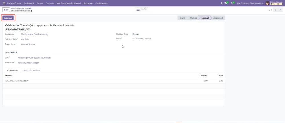 - The supervisor must review the unload transfer and click Approve to finalize the transfer of unsold products back to the warehouse.