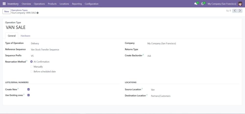 - The VAN_SALE operation type is designed for transferring stock from the van to partner or customer locations.