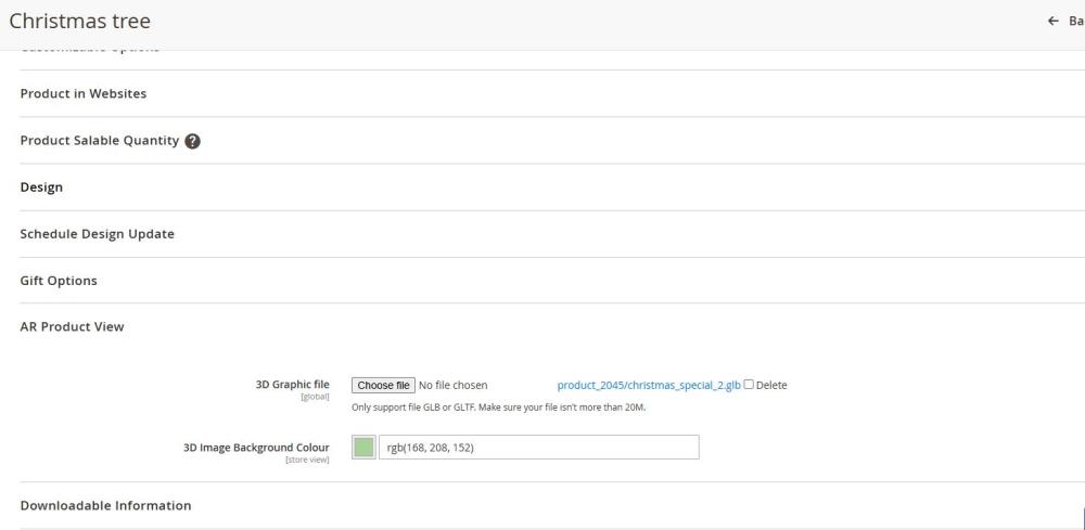 Administrators can add the 3D file in Product Add/Edit page. On this page, there exists a section named ‘AR Product View.' Within this section, an attribute named '3D Graphic file' is provided, allowing administrators to add the 3D GLB or GLTF file. Also have attribute for background colour ‘3D Image Background Colour’ to change the background colour for a specific product.