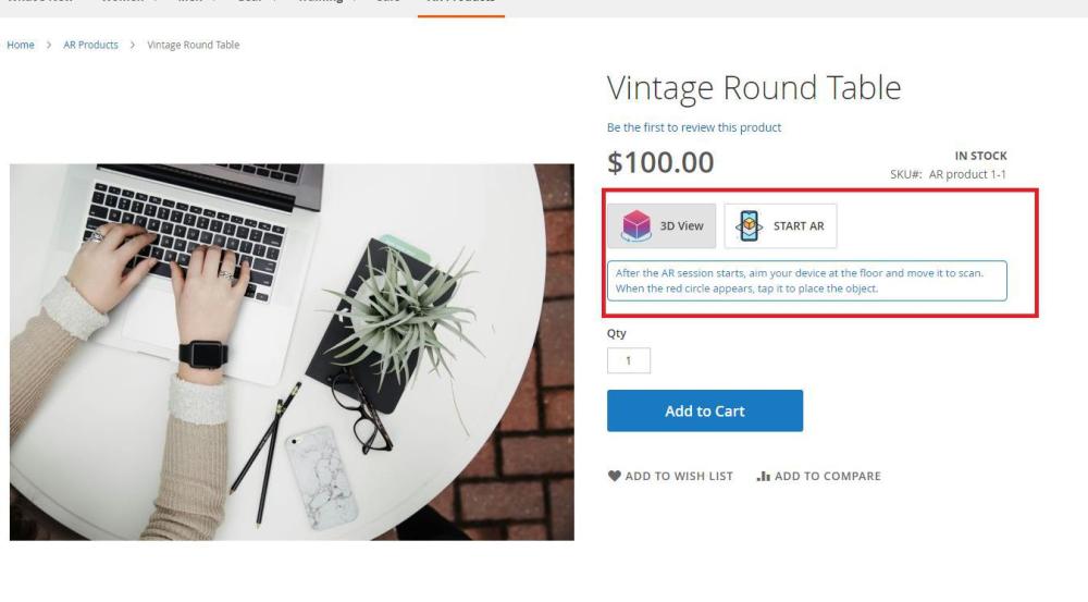 When customers visit a product page with an added 3D file, they will see two buttons (Figure 4): one for a 3D view and another for an AR view. Clicking the 3D View button opens a popup (Figure 5) where customers can see the product in a 3D view. When the customer clicks the Start AR button (available only in mobile view or on web browsers that support WebXR or similar technologies), it opens the AR product view (Figure 6).