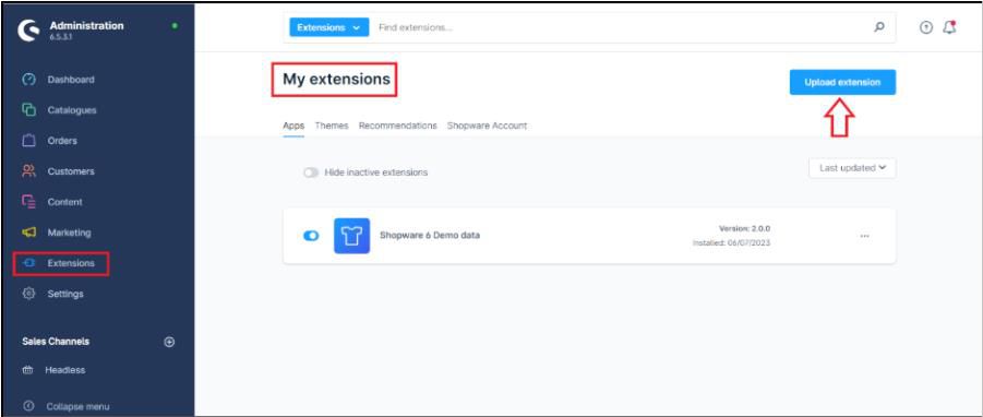 - Go to Shopware administration, in the left panel, click on ‘Extensions’ and then click ‘My extensions’. In the ‘My extensions’ page, click on ‘Upload extension’ button.