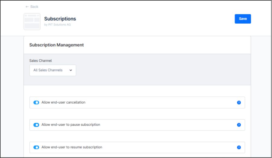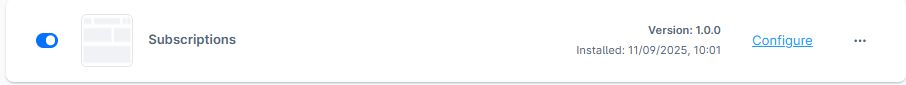 The general settings which are applicable for all products are managed in configure page of the extension. Product specific configurations for Subscriptions can be made in Catalogues > Products > Select a product > Subscriptions.