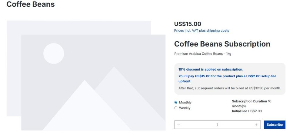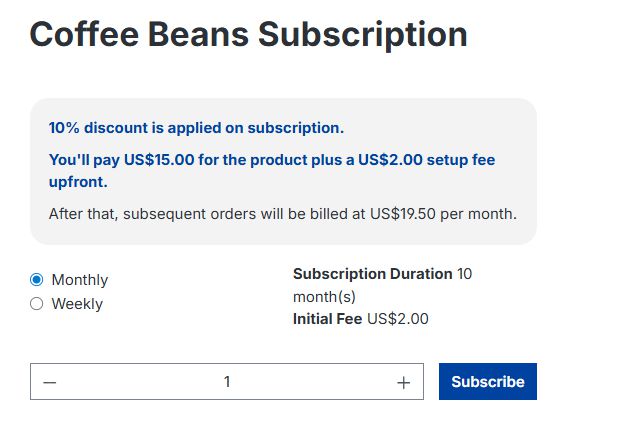 Selecting a subscription option—such as weekly or monthly—will display the discount applied to subsequent recurring orders and the initial price added to the cart when the user chooses to purchase the subscription. It will also show how subsequent orders are billed, for example, on a weekly or monthly basis.