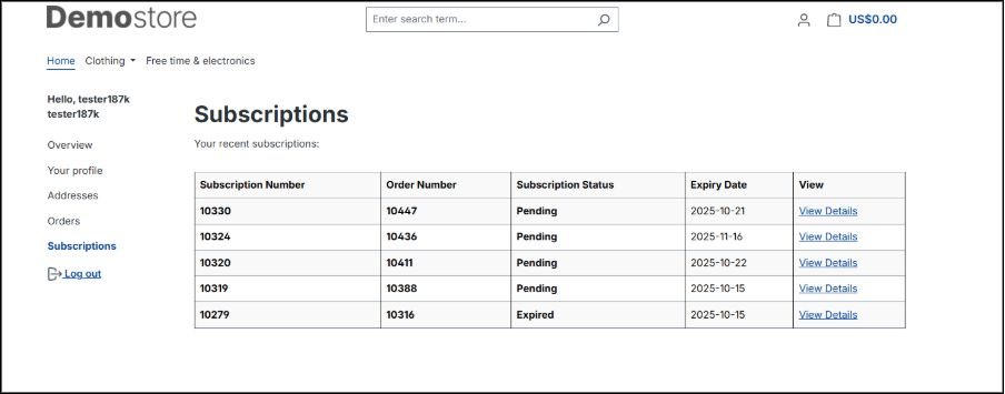 The purchased subscription can be viewed on the customer’s Your Account page, where all subscriptions associated with the customer are listed.