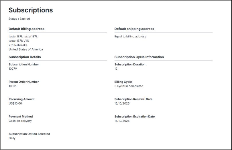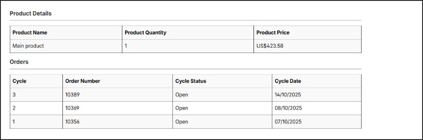The product details section displays the product included in the subscription, and the orders section lists the completed subscription cycles along with their respective cycle dates.