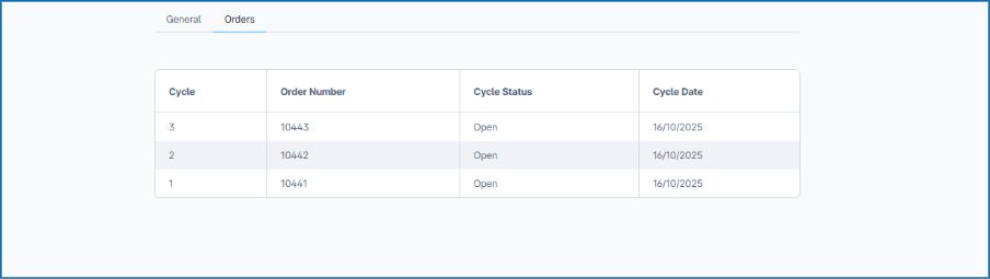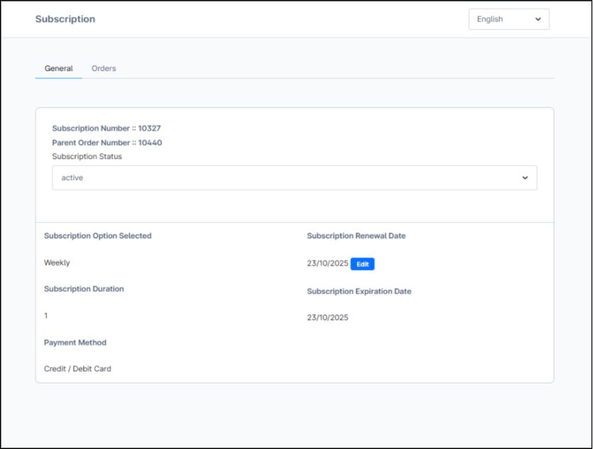 Click on the subscription number to view the details of any subscriptions. Subscription details display two tabs – General, Orders.